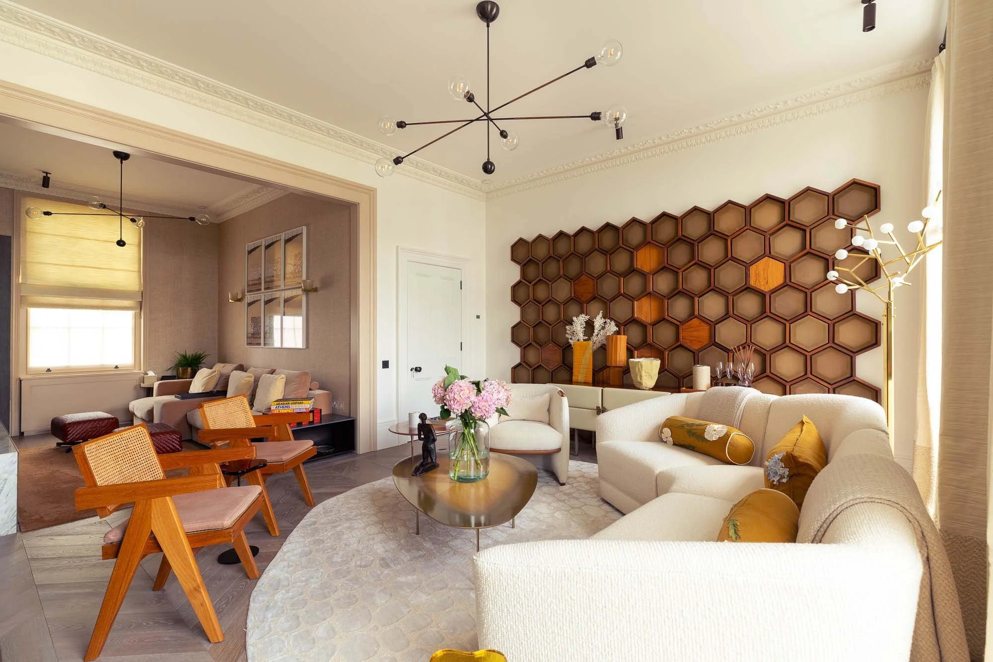 Wallpaper is a flexible choice for living and bedroom spaces, with patterns and multiple colours adding life and zest to a scheme. However, for calming and soothing interiors, we will often choose subtle and textured wallpapers in discreet, soft shades. Mixing similar shades of wallcoverings and paint can produce a scheme that appears to be simple and straightforward, but which is in fact made up of carefully chosen colours and textures that provide a luxurious multi-layered scheme. Timber panelling is also an interesting choice for walls – and not just in the sense of traditional tongue-and-groove or framed, panelled styles. Our teams can design contemporary panelling to enhance different spaces, tailoring the proportions to suit the size and scale of the room. We are often working on design schemes that include bespoke built-in furniture which may take up a large proportion of wall space. That furniture may have a veneered finish - perhaps combined with inset fabric panels - so our choices for appropriate wallcoverings will need to work with those materials, either complementing or contrasting. Our architects and designers will approach each project with fresh eyes and the intention to create a scheme where each component, from bespoke furniture to paint shades and wallpaper choices work in complete harmony. The result is an interesting and perfectly balanced room.